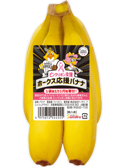 自社企画商品「ピンクリボン支援!ホークス応援バナナ」の売上の一部を認定NPO法人ハッピーマンマへ寄付し、乳がん患者様と御家族の支援、ピンクリボン活動に役立てて頂きます。